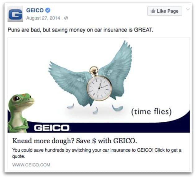 GEICO is an insurance company that specializes in auto insurance. Apparently, they also specialize in puns, which is obvious from this ad. The comical image of a clock with wings (which is completely unrelated to car insurance) is a take on “time flies.” Anyone scrolling down their timeline would definitely stop to appreciate this pun, only to realize that it was posted by an insurance company. The top-text, “Puns are bad, but saving money on car insurance is GREAT” clears things up. If that’s not enough, the headline, “Knead more dough? Save $ with GEICO” is another pun that delivers the message. The take-home message – it’s okay to use humor once in a while to market your products.