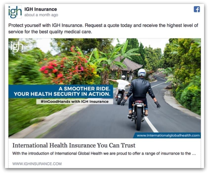 If there’s one thing that insurance companies try to sell, it’s the idea that you should live your life to the fullest. That’s the straightforward concept behind this Facebook ad for IGH Insurance. The “look ma – no hands!” ad features a colorful and captivating image of two bikers, riding their motorcycles without using their hands, which represents two things: