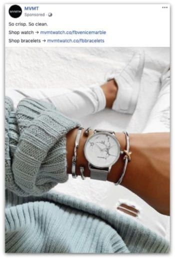 The first example that we want to discuss is this simple image ad by MVMT–a company that sells quartz watches and other accessories. This ad is a perfect representation of the fact that you don’t always need complex graphics or a high video production budget to stand out. At times, all you need is a high-quality image of your product and a simple, concise copy. The images should look professional, in which your products are the heroes (in this case, the watch and the bracelet) – the graphics and the text should only complement them.