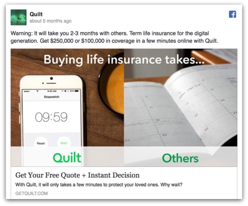 Quilt initially started out as a service that provided insurance fast. This ad, which shows a smartphone with the stopwatch open in one panel, and a calendar in the other, is a brilliant execution of the 'fast' benefit. In the right panel, the stopwatch app represents that it only takes 10 minutes to get insurance coverage with Quilt, whereas with other services, it could take up to months. This ad is simple, clean, and effective. All they’ve used are two stock photos and some text.