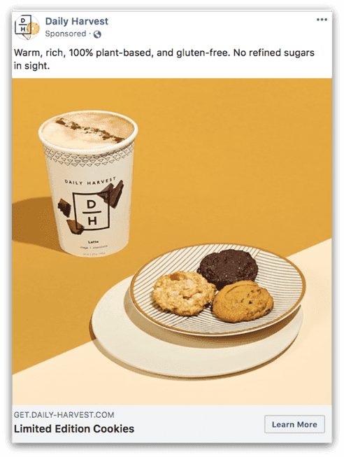 A perfect image ad is one that doesn’t rely on any on-image copy – just the product, some good ol’ photography skills, and the right choice of background colors. This ad by Daily Harvest – a company that sells organic and gluten-free products – is all of the above. The image is attractive enough to make anyone crave their scrumptious-looking cookies and latte. Apart from the image, the top-text includes all of the relevant marketable keywords while the headline, “Limited edition cookies,” is aimed at creating a sense of urgency. All in all, this ad is perfect in every sense.