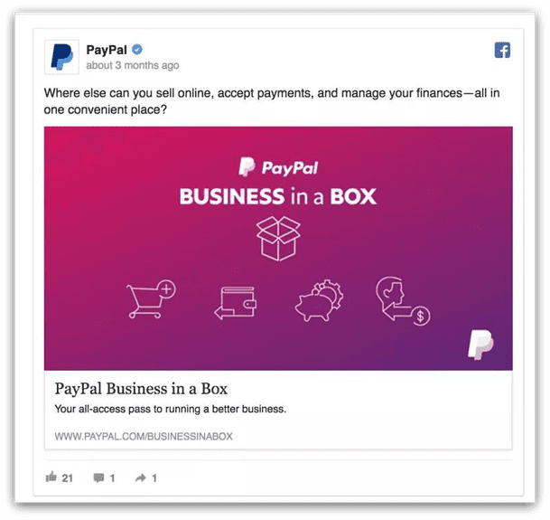 PayPal is a well-known payment merchant. This particular ad is for "Business in a Box" – a single platform by PayPal for businesses to launch their e-commerce websites, manage payments, and deal with marketing. The dark background is perfect for capturing attention, whereas the copy and the icon deliver the message perfectly.