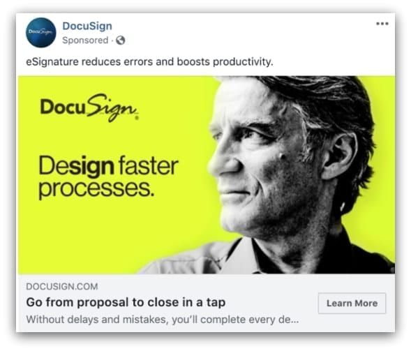 DocuSign is a cloud-based e-signature service that facilitates online agreements, contracts, and sales. The two selling points of the service are that it expedites important agreements and reduces the chances of errors. Those are the exact things that they’ve tried to sell through this image ad. The black and white side-pose headshot on a vibrant green background gives the image a retro feel. In the copy “Design faster processes,” they’ve written the letters that spell “sign” in bold – a subtle way to promote their e-signature services without even using the word “sign.” The lesson here is that you can also use simple font-formatting to deliver your message.